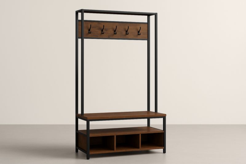 Cadre en acier au carbone peint, panneaux en MDF avec placage décoratif effet bois, crochets en acier peint.
